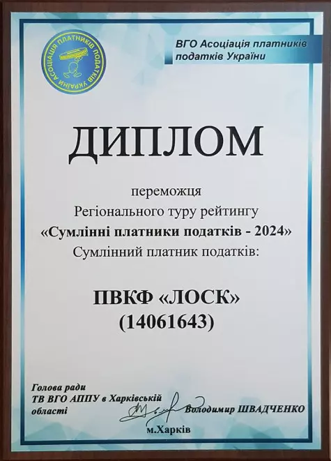 Фірма «Лоск» стала переможцем першого Туру (регіонального Рейтингу) «Сумлінні платники податків-2024» та продемонструвала високі здобутки з дотримання податкової дисципліни, сплати місцевих та державних податків, кількості створених робочих місць та фінансової підтримки соціальних програм.